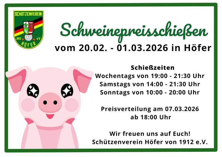 Vom 20.02. bis zum 01.03.2026 findet das Schweinepreisschießen bei uns im Schützenheim statt. Die Preisverteilung wird am 07.03.2026 stattfinden.